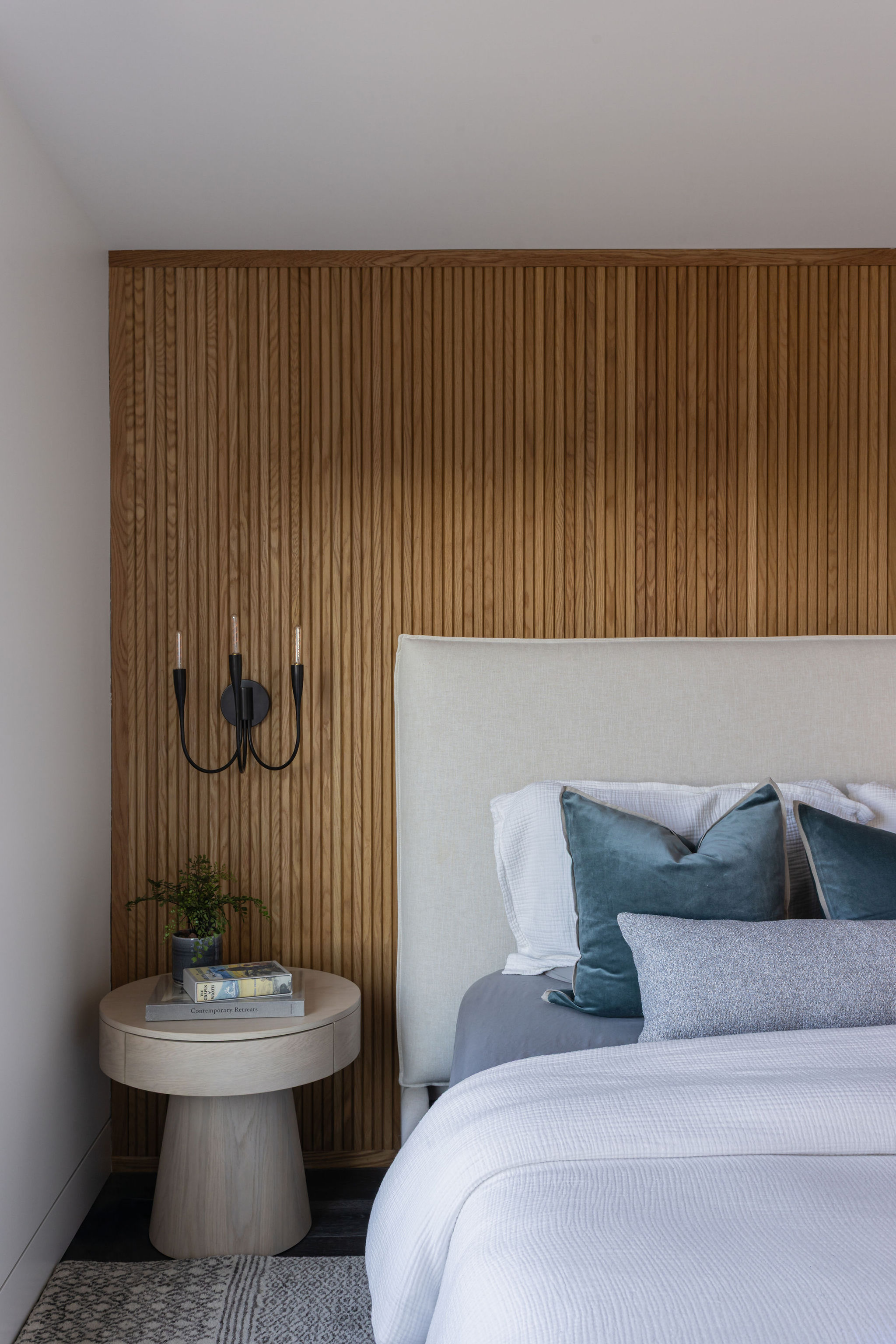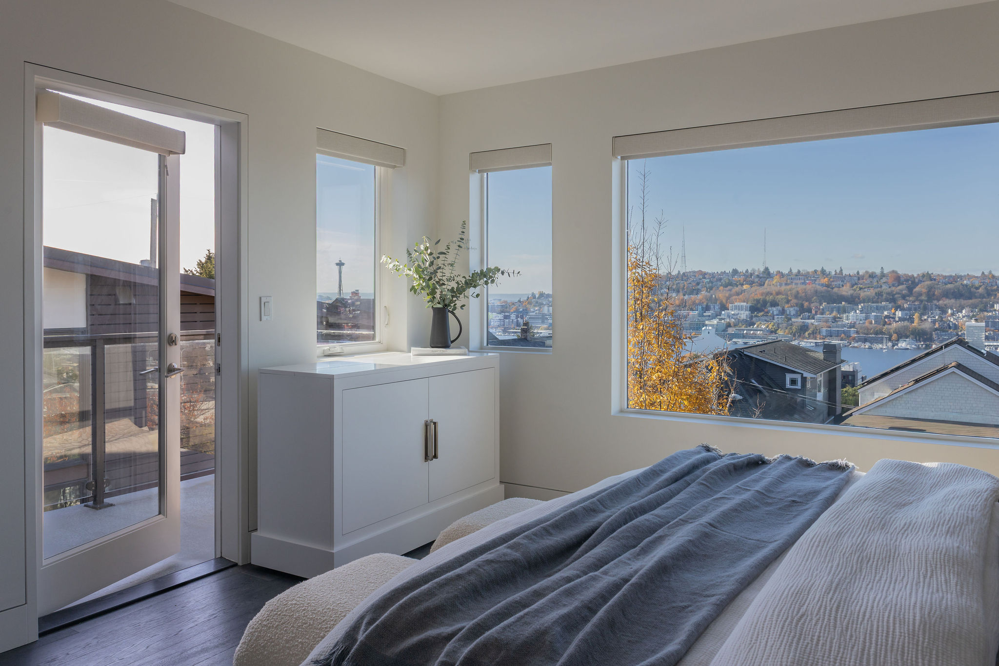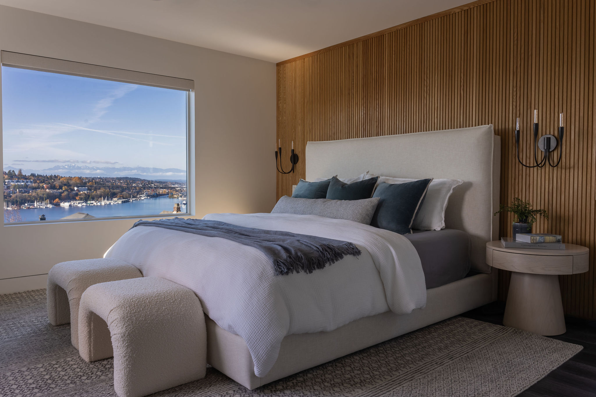 This contemporary Capitol Hill home—already bright with natural light and sweeping lake views—was elevated into a an organic Pacific Northwest retreat. A custom white oak feature wall in the bedroom and a complementing vanity in the primary bath adds warmth and grounds the space. Soft palettes of blue, gray, and white hues reflect the misty Lake Union landscape and Washington skies.
