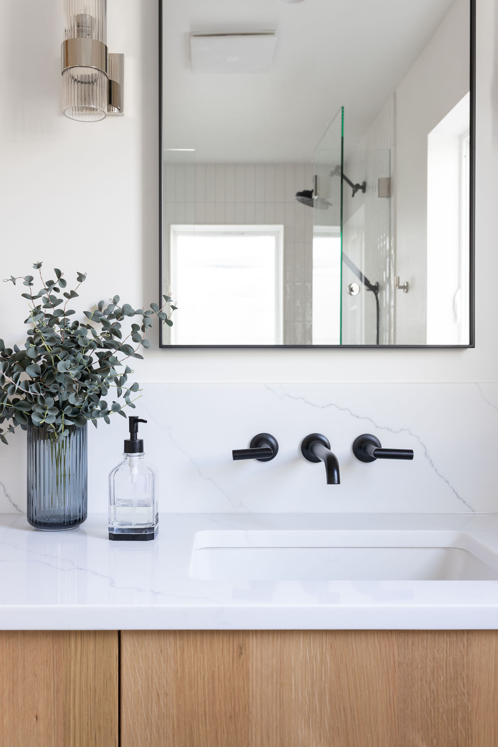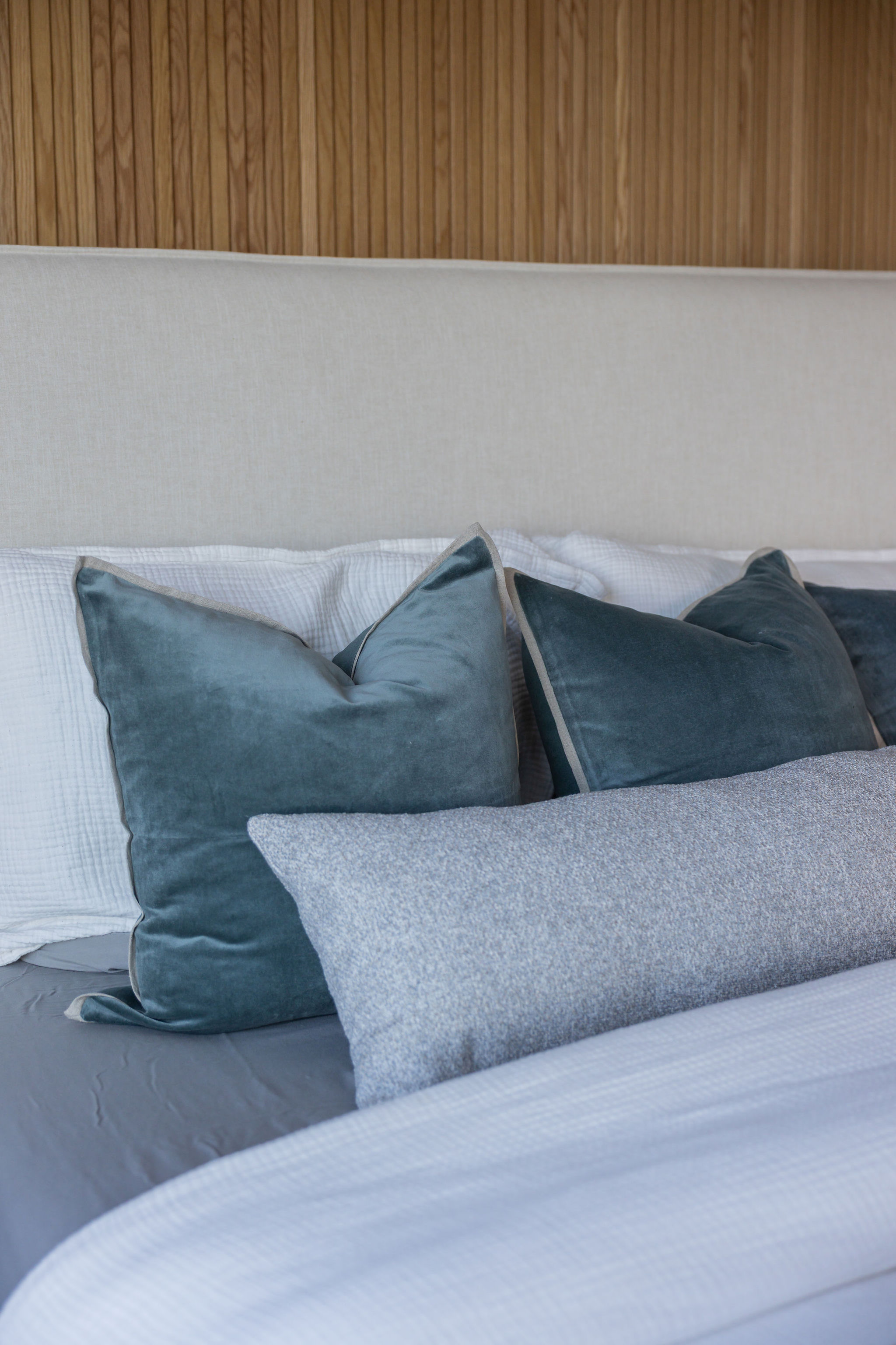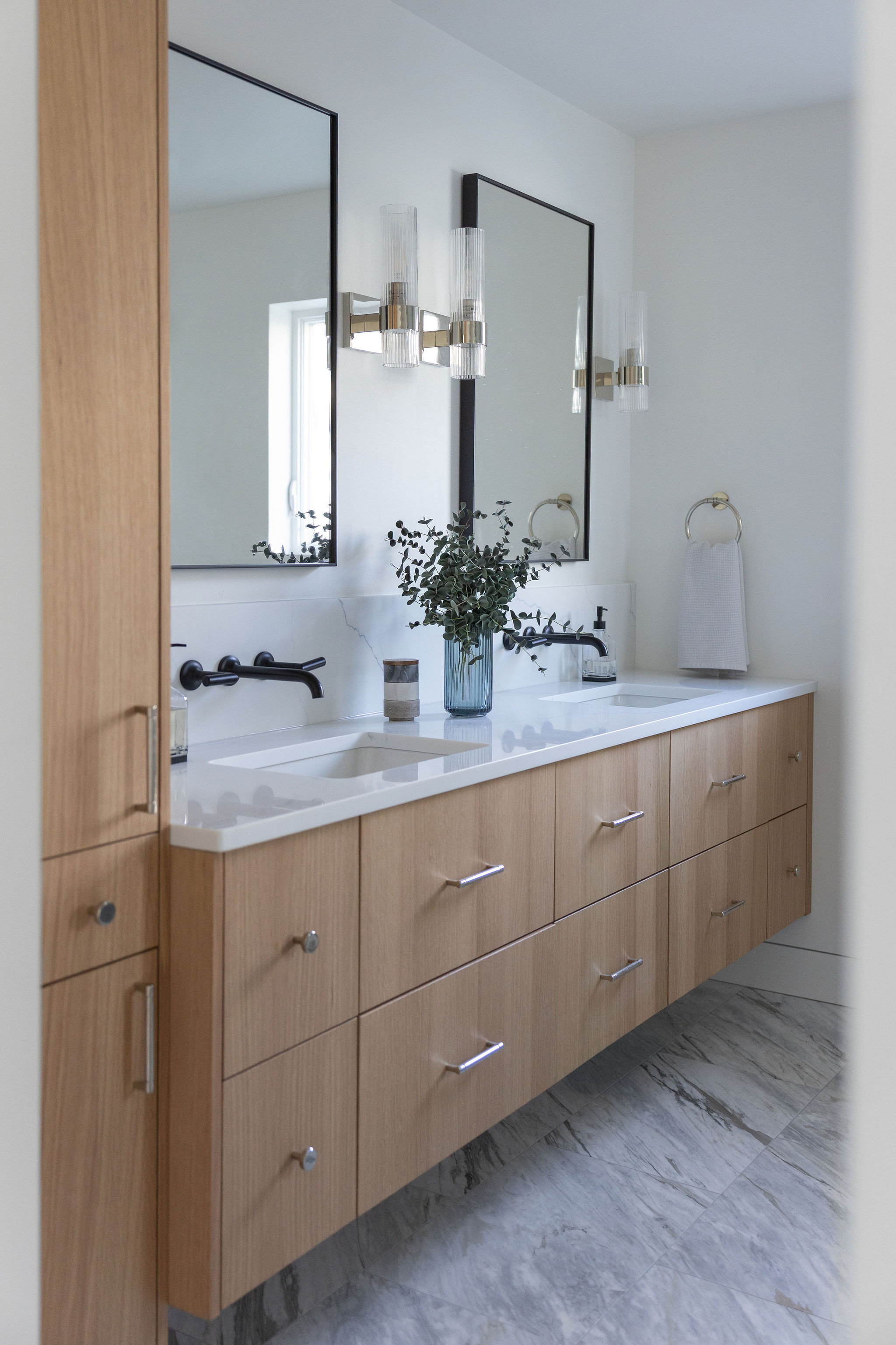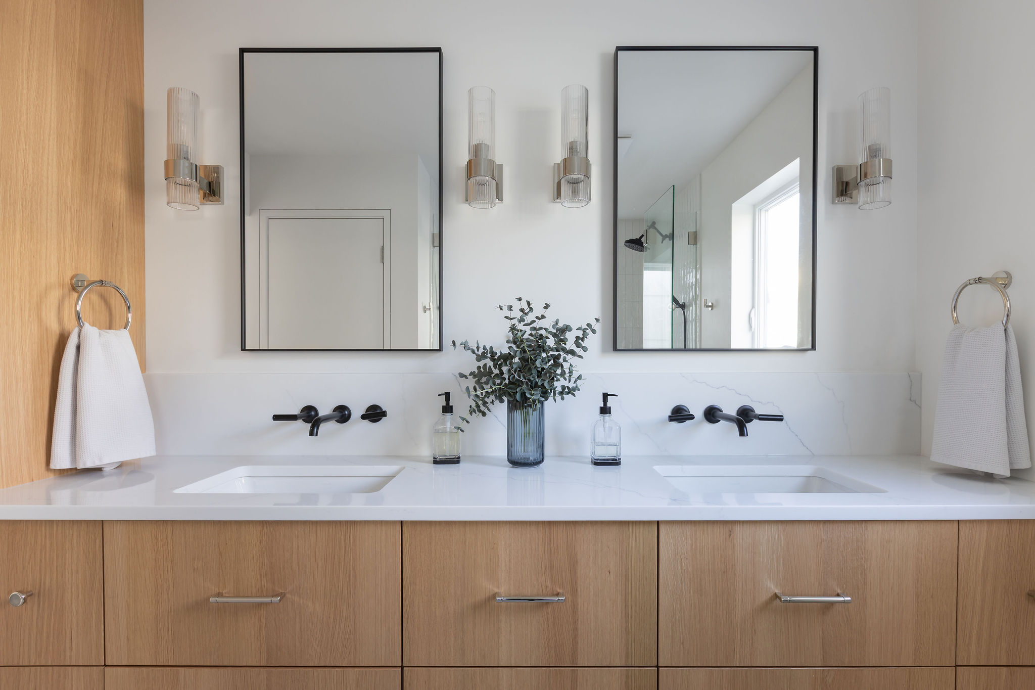 This contemporary Capitol Hill home—already bright with natural light and sweeping lake views—was elevated into a an organic Pacific Northwest retreat. A custom white oak feature wall in the bedroom and a complementing vanity in the primary bath adds warmth and grounds the space. Soft palettes of blue, gray, and white hues reflect the misty Lake Union landscape and Washington skies.