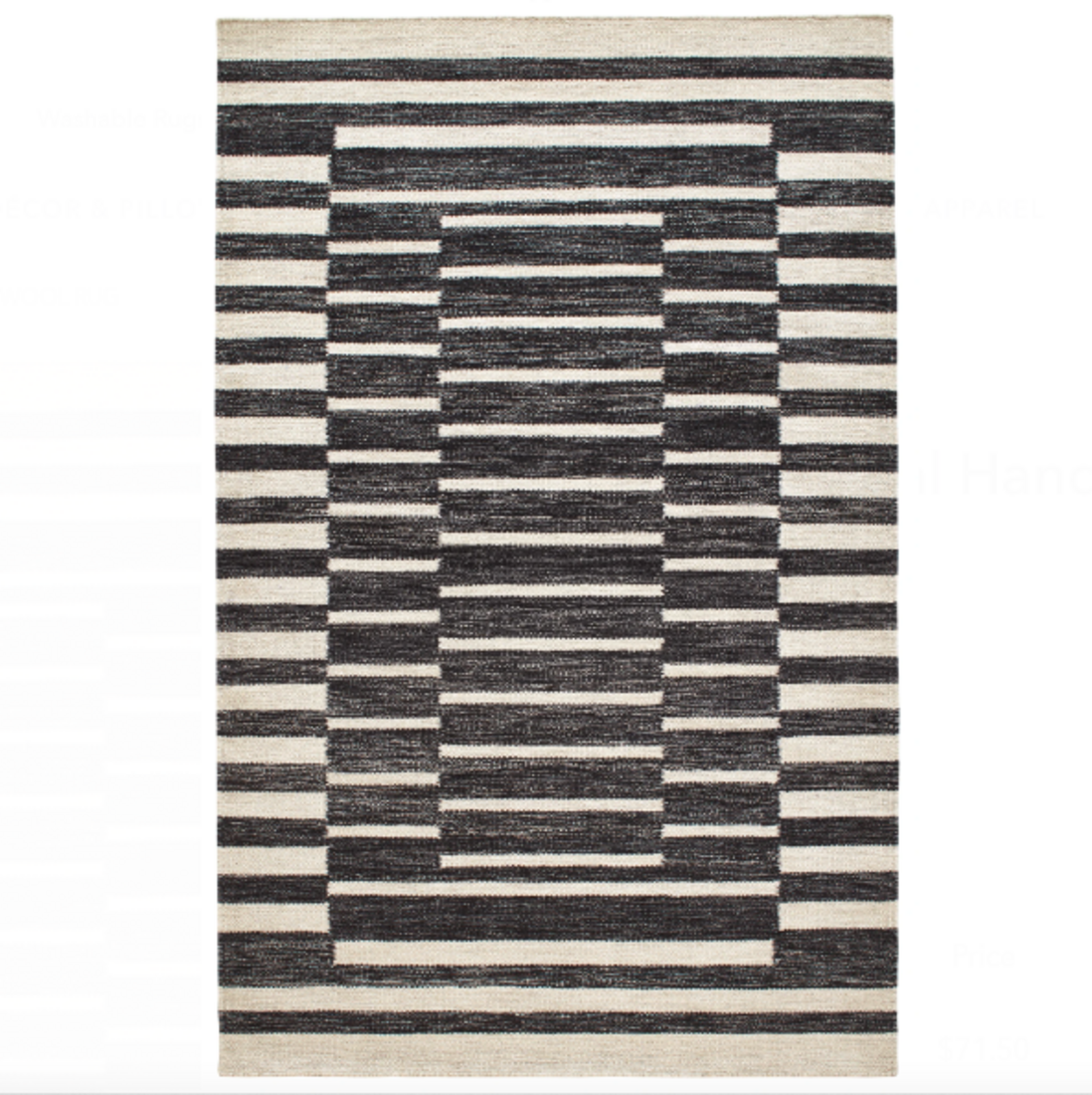 76% Wool, 14% Cotton, 8% Polyester, 2% Other, hand made flatweave, low pile, durable, easy to clean, soft underfoot, bold architectural pattern