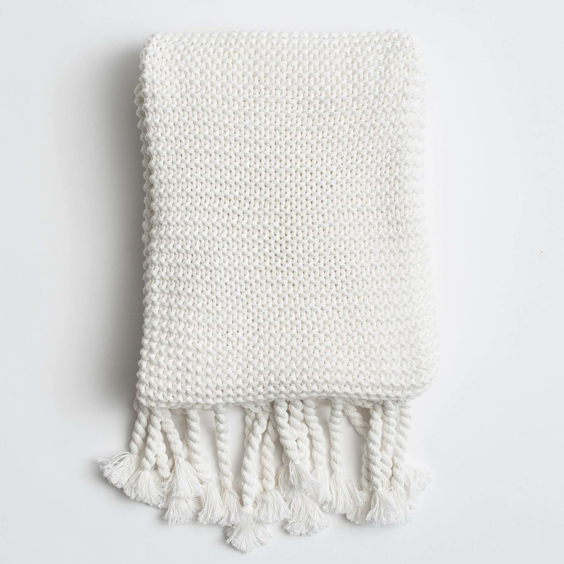 Organic and oversized, this soft white knit throw blanket is perfect for wrapping up or staging your chair perfectly.