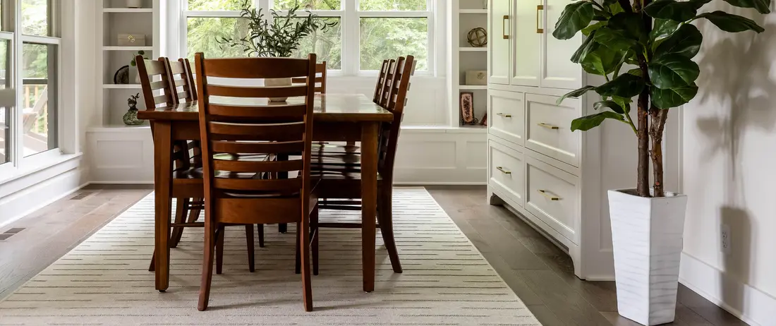 Vacuum for routine cleaning, blot liquid spills with clean cloth immediately. Wring out a small amount of warm water and blot up with clean cloth, do not rub stain. Continue to repeat as needed but do not oversaturate carpet as it may damage wool pile. Stain remover can be used for more persistent stains, we recommend Spot Off (sold at The Phinery). Professional cleaning recommended for large/dark stains that do not come up easily.
